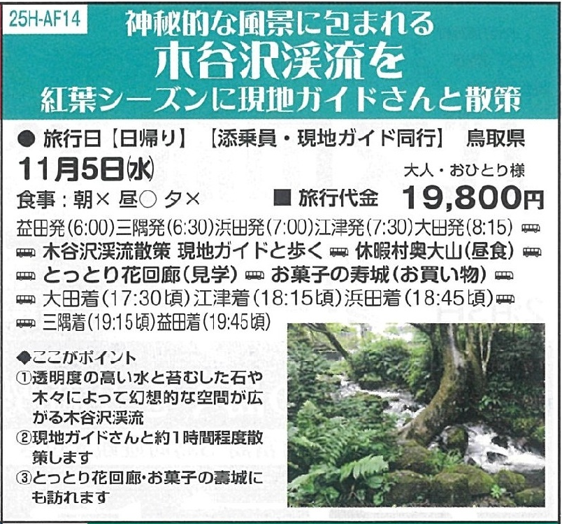 11/5(水)発【日帰り】神秘的な風景に包まれる 木谷沢渓流を紅葉の季節に現地ガイドさんと散策