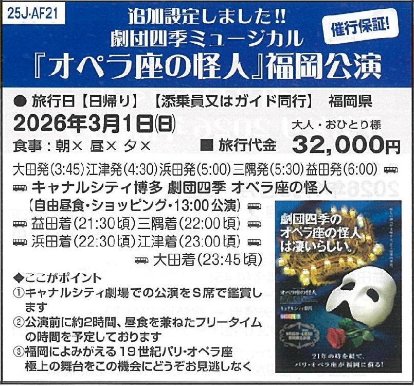 R8.3.1(日)発【日帰り】追加設定!劇団四季ミュージカル「オペラ座の怪人」福岡公演