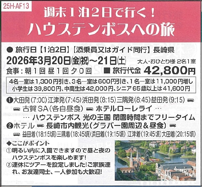 | 旅行日【1泊2日】【添乗員またはガイド同行】 | ||