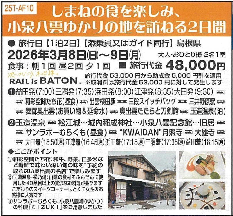 しまねの食を楽しみ、小泉八雲ゆかりの地を訪ねる2日間
