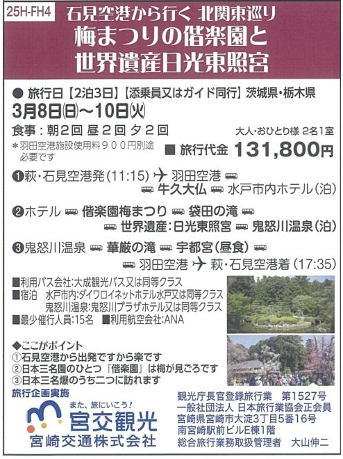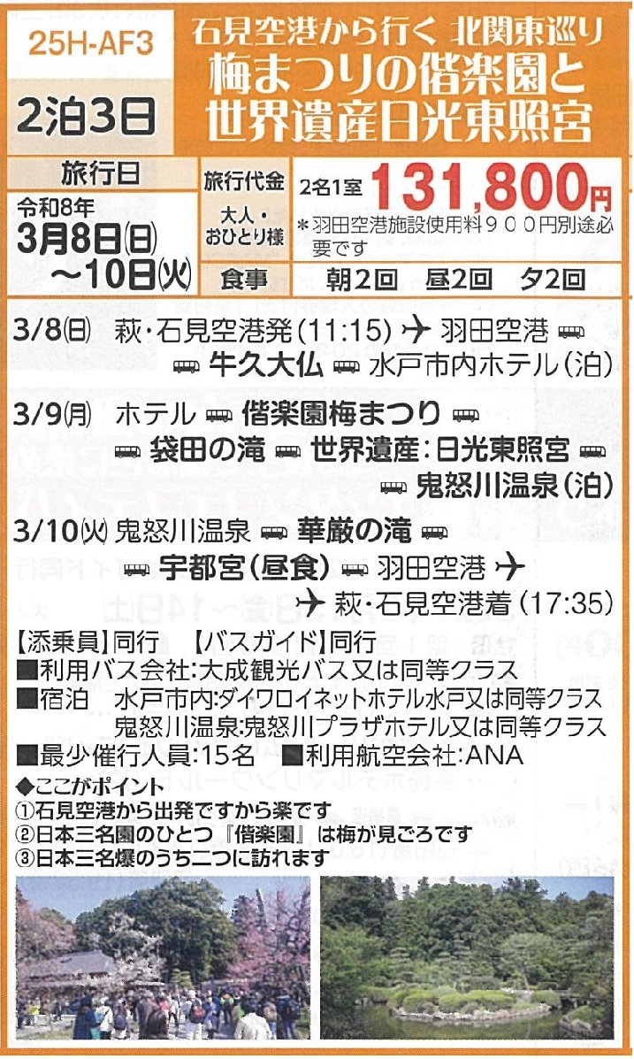 石見空港から行く 北関東巡り 梅まつりの偕楽園と世界遺産日光東照宮